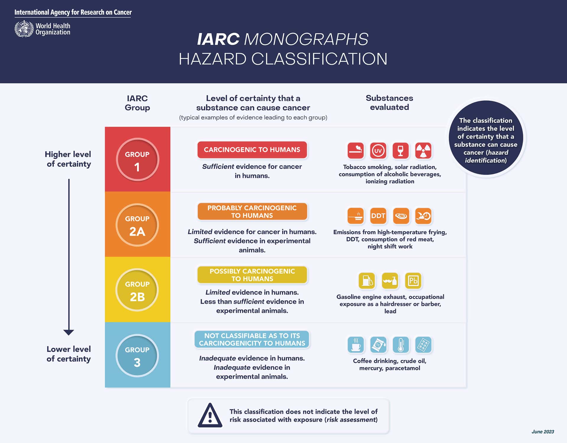 The International Agency for Research on Cancer organizes agents within 4 categories depending on the level of certainty that the agent can cause cancer. The infographic below illustrates the 4 different categories.