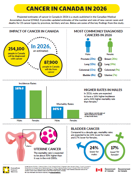 • Cancer continues to be the leading cause of death in Canada, with about 1 in 4 deaths in 2026 from cancer.
