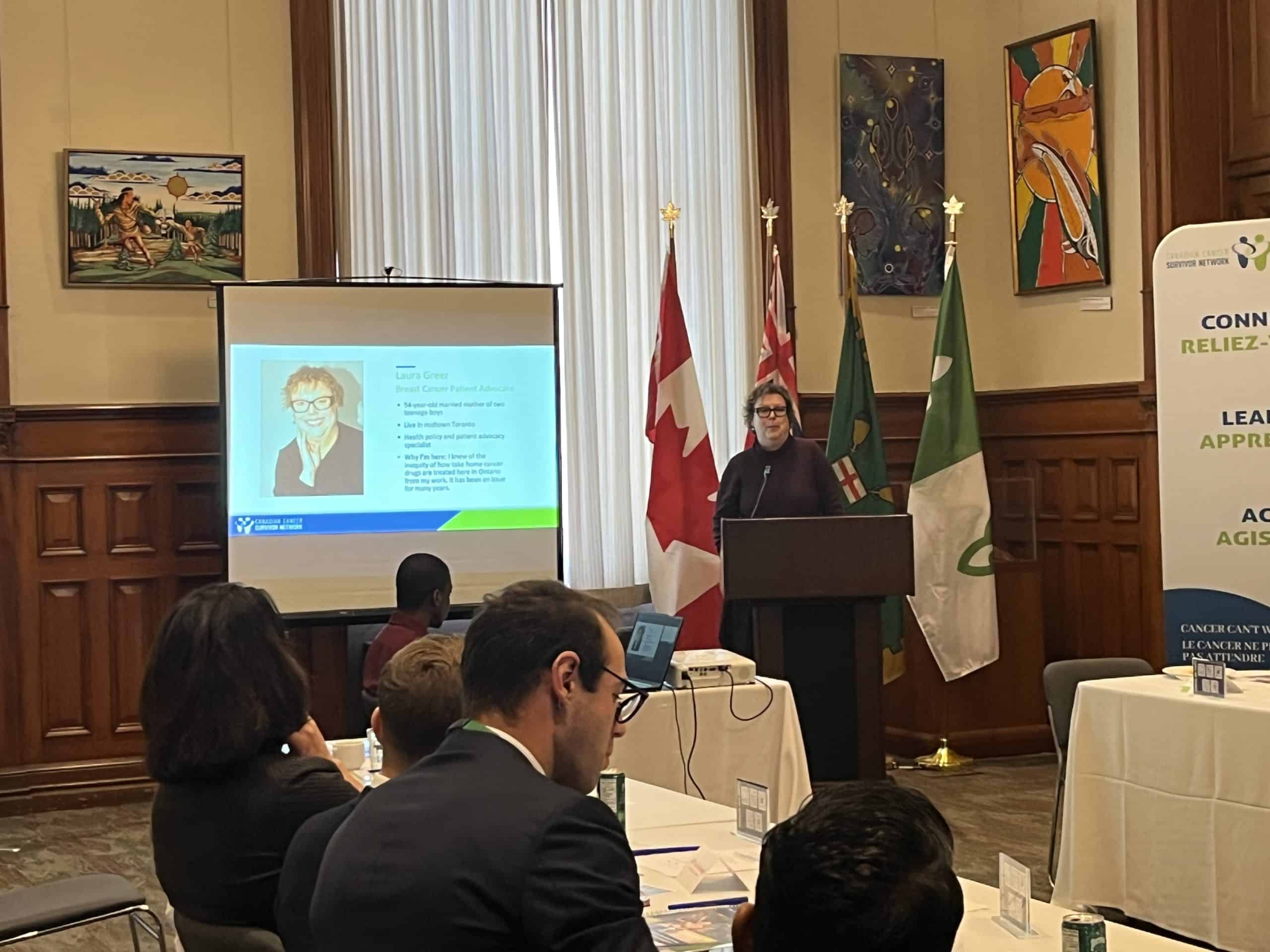 Timm then introduced Laura Greer, Executive Vice President at Burson, Health & Wellness + Global Client Lead, and patient advocate. Greer and CCSN has had a long working history, with Greer saying she had known President & CEO Jackie Manthorne for over the last 17 years. Greer is also a metastatic breast cancer patient who was diagnosed four years ago. However, even with 25 years of health, public affairs, and advocacy experience, she did not expect to deal with the financial challenges of take-home cancer drugs herself.